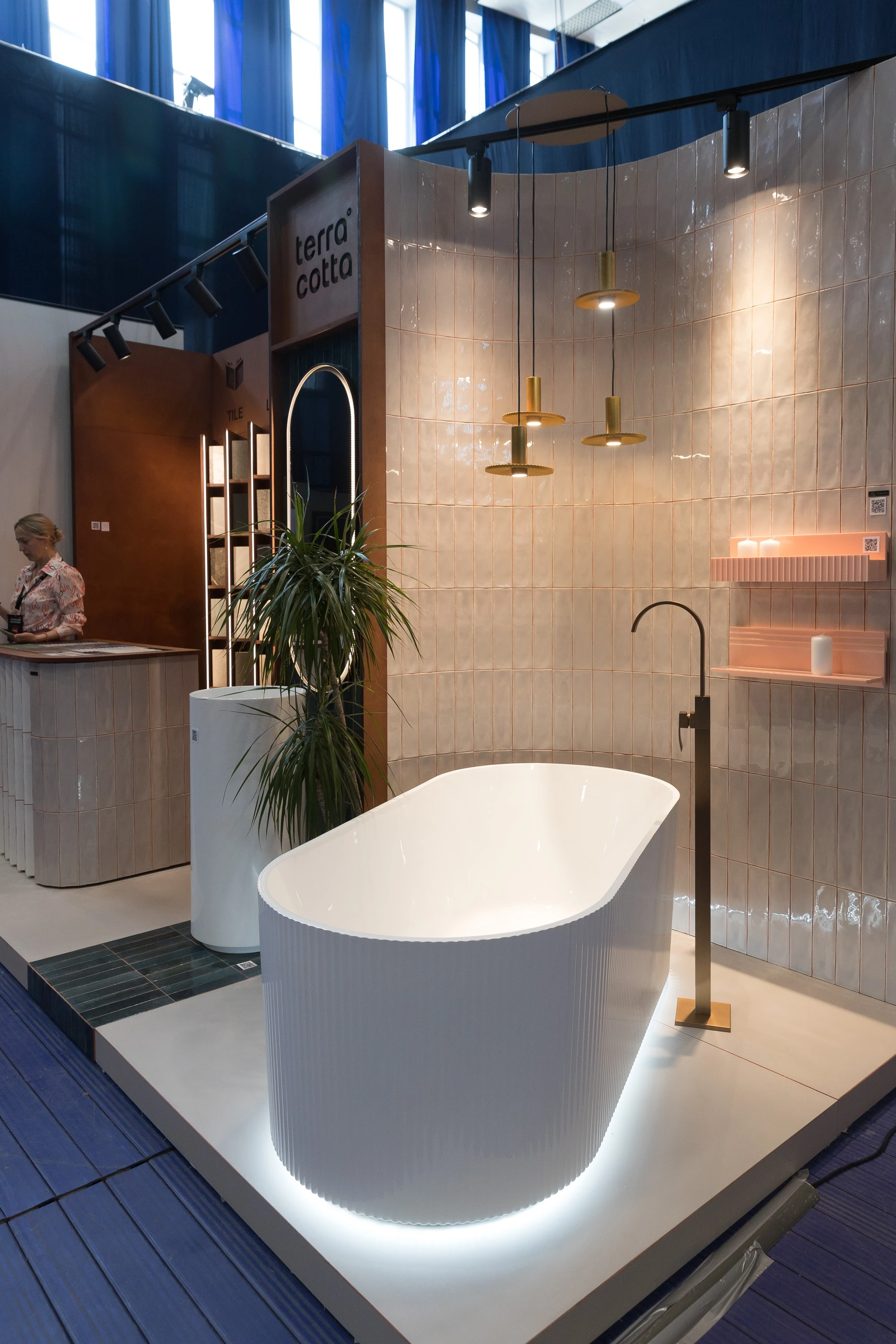 Однако самой фотографируемой частью стенда Терра Котта стала "парящая" ванна на фоне радиусной стены с нежной бледно-розовой плиткой Mainzu Origin. Напольная плитка - опять-таки крупный формат Cielo e Terra.